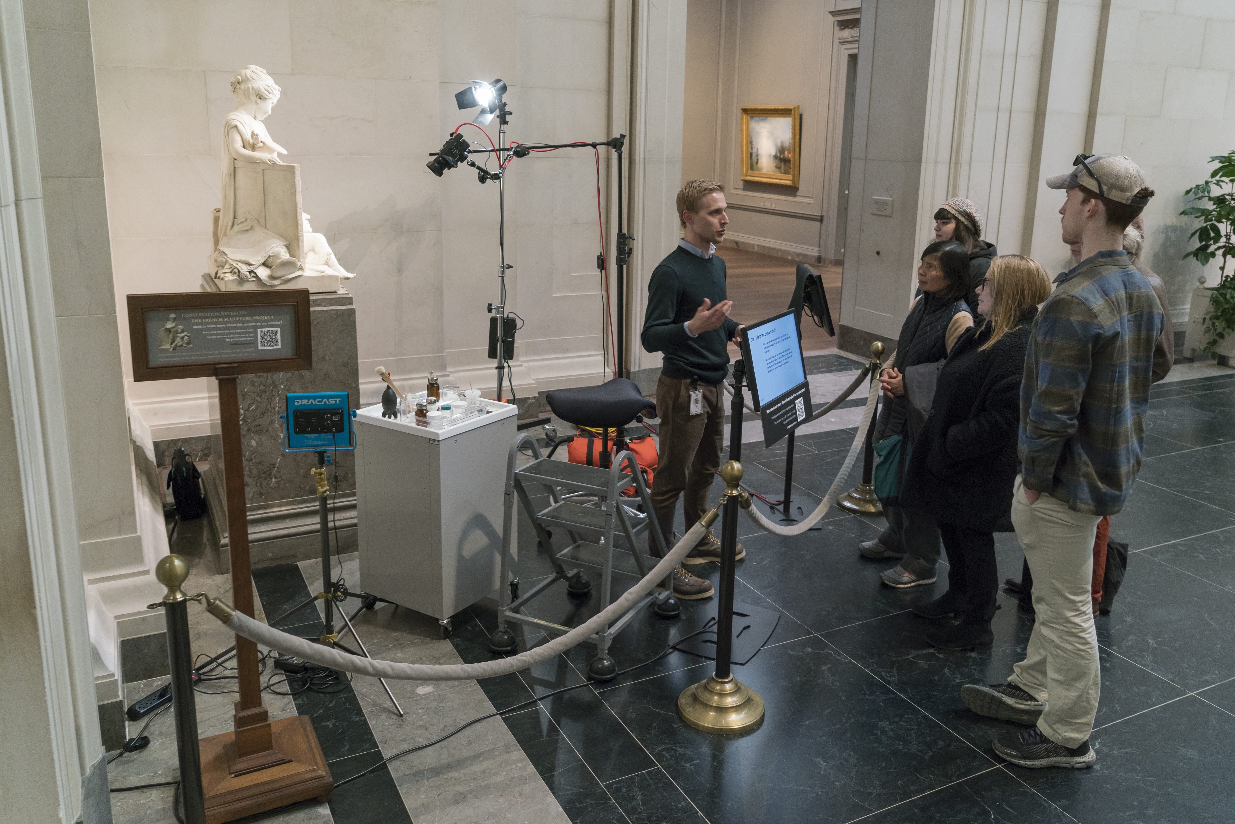Before the Gallery closed in March, you could find me on most days in the East Sculpture Hall of the West Building cleaning Painting and Sculpture, an 18th-century marble sculpture by Jean-Pierre-Antoine Tassaert, as part of Conservation Revealed: The French Sculpture Project. This type of work usually takes place in the conservation lab downstairs, but with funding from Bank of America, we were able to set up a mini-studio in the gallery itself and share the process with our visitors—another passion of mine.