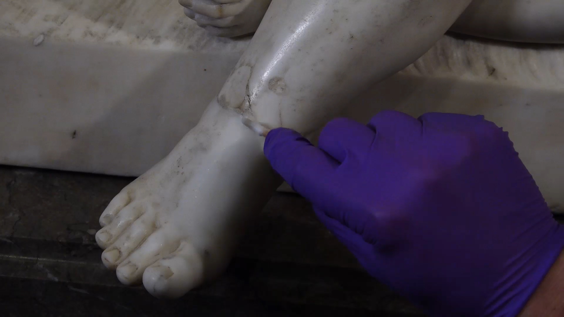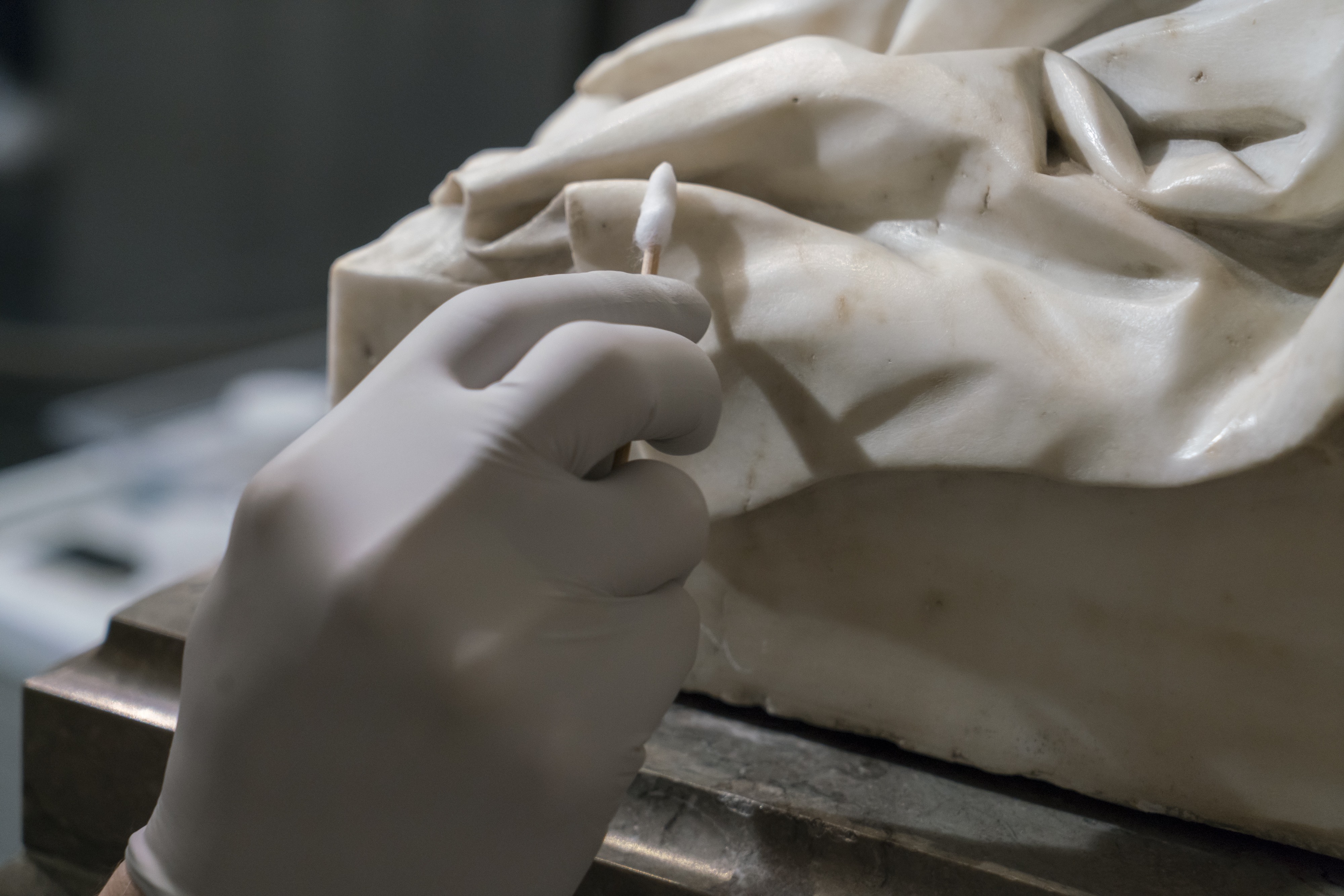 In addition to the oils deposited through touch, which will eventually darken stone surfaces, our very presence in the galleries is also responsible for the majority of the dust that forms and is deposited onto the works of art. These materials contribute to a dulled appearance, but they also support colonies of microorganisms that can cause additional complications. In a paradoxical sense, my job is to mitigate the impact of touch, and physical presence, with my own touch and presence.
