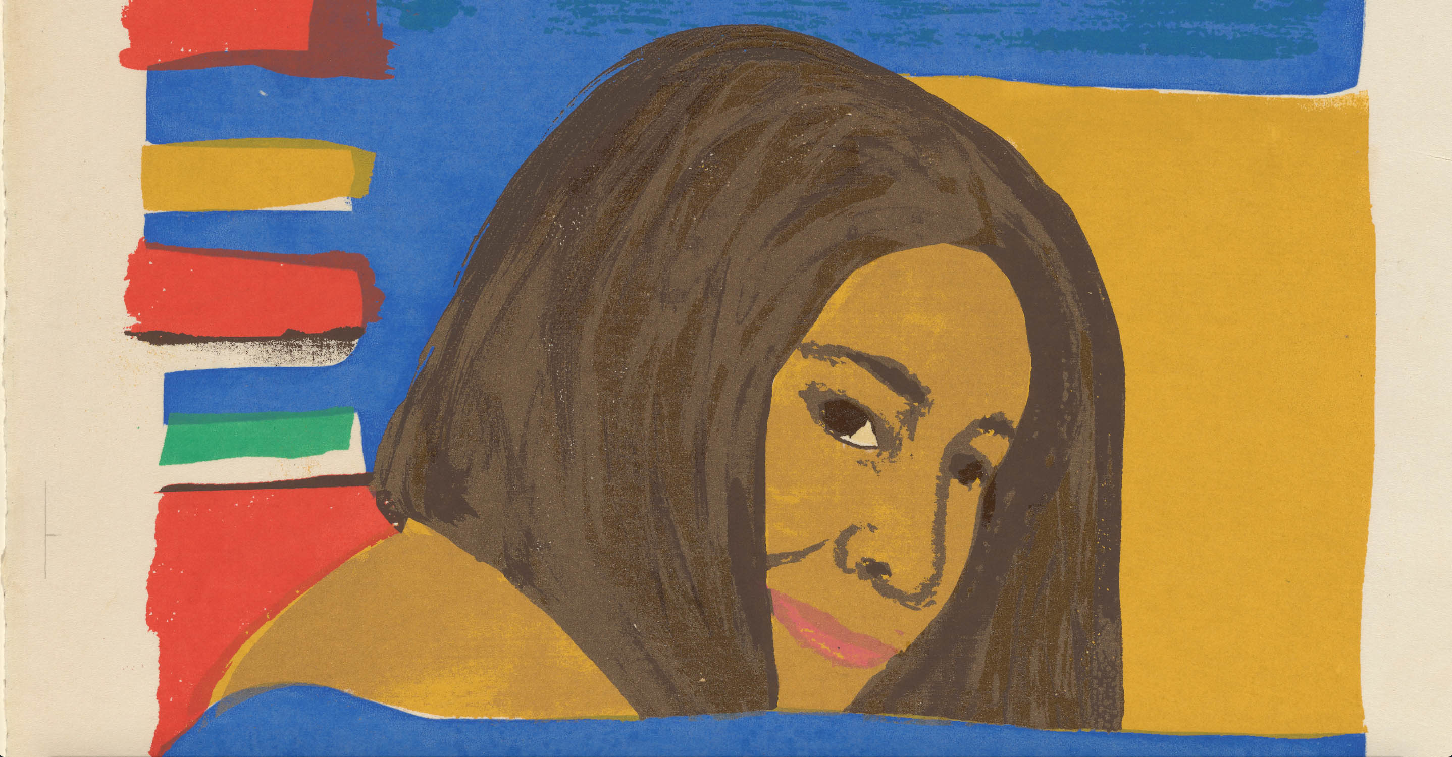 Amos designed textile patterns early in her career. I see evidence of that history—her adeptness at arranging color and pattern—in the bold, graphic, geometric shapes of the background. One blue stripe at the bottom serves as a foreground, overlapping Amos’s shoulder, hair, and chin as though she’s tucked behind it. There is an interplay between the artist’s face and the block of color just to the right of it—it seems Amos used the same matte gold ink for both, with a thin overlay of brown on her face adding more dimension to the flat plane of color.