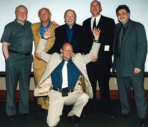 Left to right: Richard Anuszkiewicz, James Rosenquist, Robert Rauschenberg, Hank Hine, Donald Saff; kneeling in center: David Bradshaw