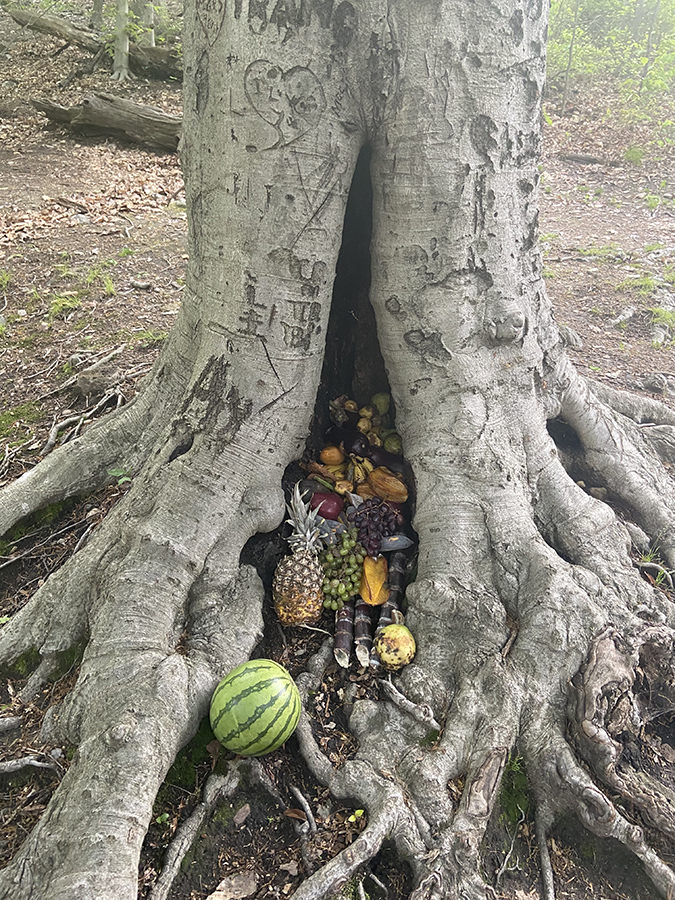 Dog walks. So many dog walks. Over the recent months of quarantine, daily strolls in the woods near my home have provided welcome exercise, stress release, and changes of scenery. As refreshing breaks from the screen time and virtual meetings that punctuate my days as a curator working from home, these pandemic-era, nature-focused outings substitute, perhaps, for the restorative walks I used to take through our art-filled galleries. Luckily, walks are my enthusiastic dog’s lifeblood no matter the state of the world. So it was that on a cool, early May morning we found ourselves on a familiar trail when she sniffed out something decidedly unfamiliar at the path’s edge: a cornucopia of assorted fresh fruit and sugarcane nestled in the large, empty hollow of a beautiful old beech tree. Pineapple, star fruit, guava, watermelon, eggplant, mangos, grapes, bananas, plantains, apples, and cane stalks spilled out of the deep, triangular-shaped crevice.