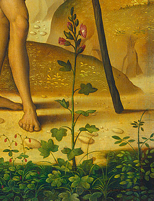 Perugino applied this new symbolic language in his unusually quiet and meditative portrayal of the Crucifixion theme. It is not the more typical scene of a mother’s anguish at the violent death of her son or his followers’ despair, as can be seen in examples painted by Matthias Grünewald and Luca Signorelli. With Perugino, our eye is drawn to the lush, tranquil landscape and the array of plants beneath the cross and at the feet of the saints. These purposely placed plants convey meaning and message.