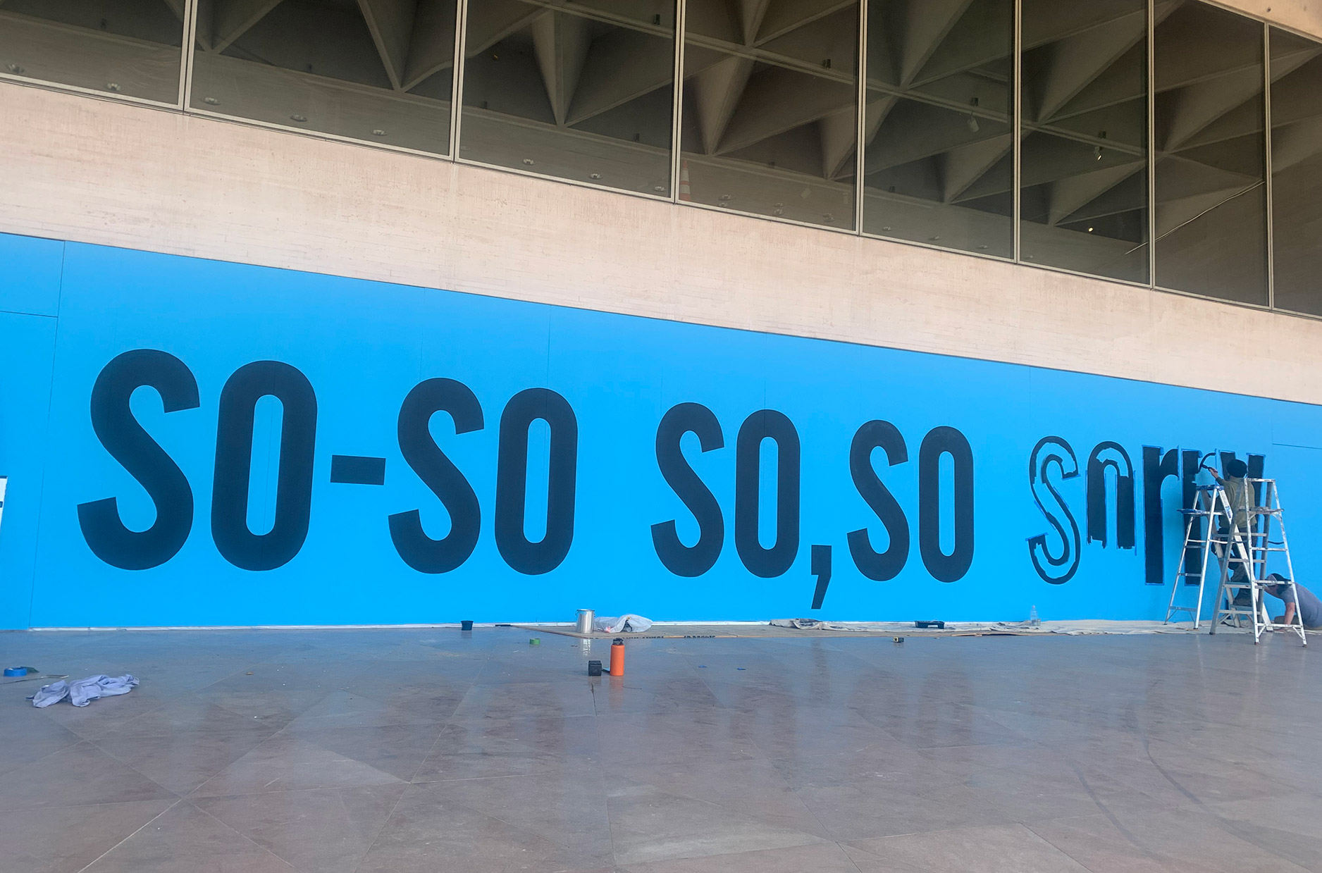 Kay Rosen is one of three artists commissioned by the National Gallery as part of Artist Projects to transform temporary construction walls and empty spaces outside and inside the East Building into places for site-responsive installations. She created SORRY for the facade of the East Building, where the main entrance is closed during renovation. By combining the word sorry with variations on so, the work generates a range of expressions, from a half-hearted to a sincere apology.