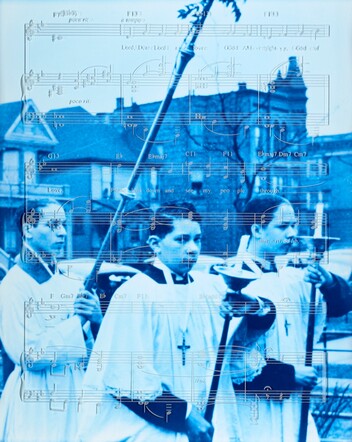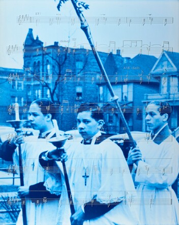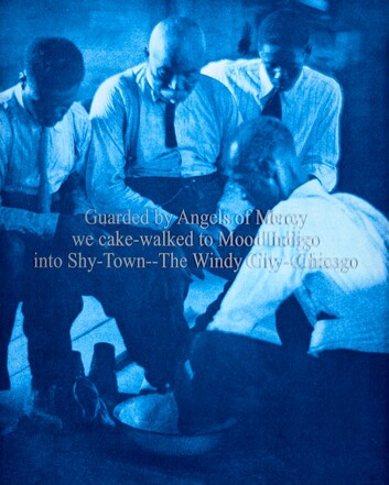 As we read the text etched into the glass on top of these pictures, we quickly see that Weems is poetically alluding to the history of African Americans since the Civil War: “Guarded by Angels of Mercy we cake-walked to Mood Indigo into Shy-Town--The Windy City--Chicago”; “Arriving in Bronzeville we became killers of sheep men of letters, women of steel”; “Jet Black or Indian Red our scale of values differs from that of the world from which we have been excluded.” In addition, the references to Ellington’s “Mood Indigo,” Davis’s “All Blues,” and pictures of foot washing and a processional covered with glass etched with a page of the score of Ellington’s “Come Sunday” infuse the piece with religious overtones and allusions to the power of music. Together these seven pictures create a work that is, as the “Come Sunday” lyrics note, a plea to God to “please look down and see my people through.” In this exceptionally compelling piece Weems reframes the work of white artists—Saint-Gaudens, Benson, Lee, and Ulmann—to present a new and more complex narrative centered on African American history, culture, and experience.