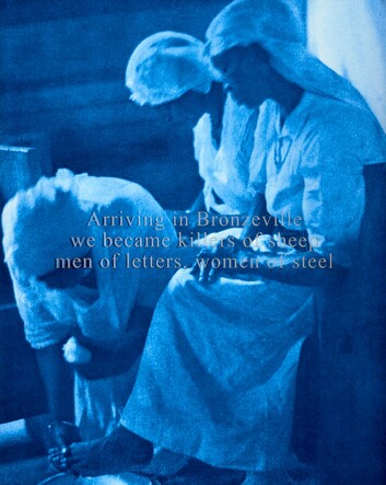 The third and fifth pictures are reproductions of photographs by Doris Ulmann from her book Roll, Jordan, Roll with a text by Julia Peterkin. They depict the ceremonial act of foot washing, an act that signals service and humility. The text etched into the glass alludes to the importance of Chicago for African Americans and to the new professions it offered them.