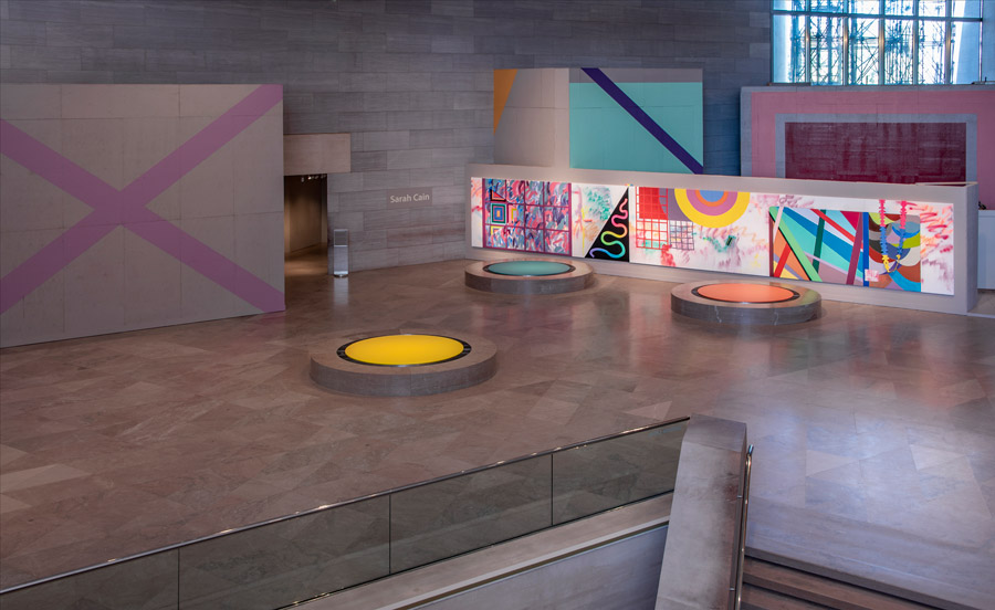 The National Gallery commissioned three artists—Sarah Cain, Avish Khebrehzadeh, and Kay Rosen—to transform temporary construction walls and empty spaces inside and outside the East Building into places for site-responsive installations for Artist Projects. Cain created My favorite season is the fall of the patriarchy, a 45-foot-long abstract painting installed on a temporary wall that protects permanent collection sculptures.
