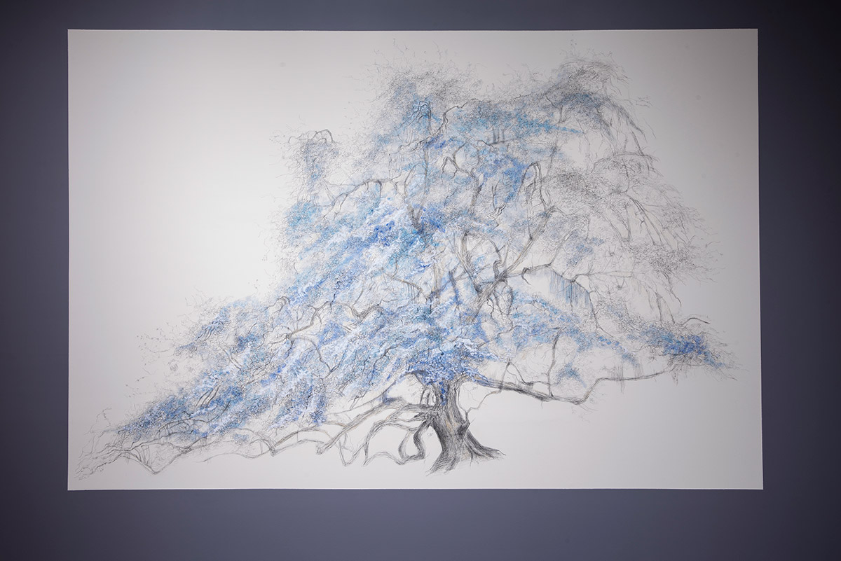 Avish Khebrehzadeh, Tree of Life in Blue, 2021, pencil, dry pastel, and oil pastel on wall. Courtesy of the Artist.
