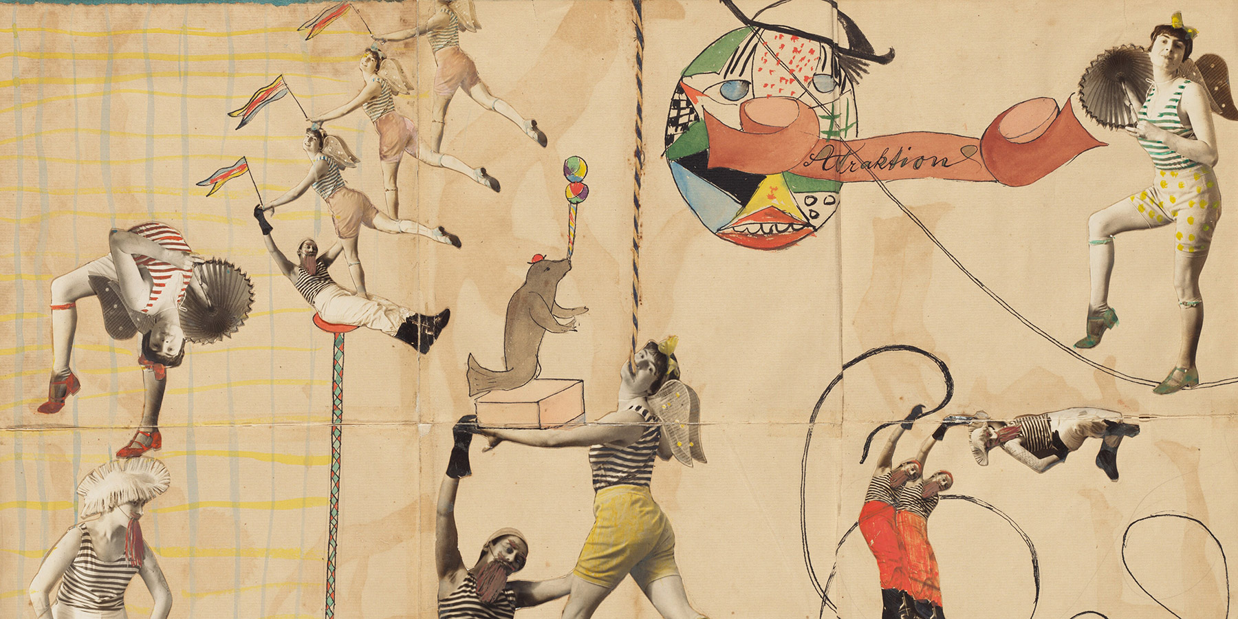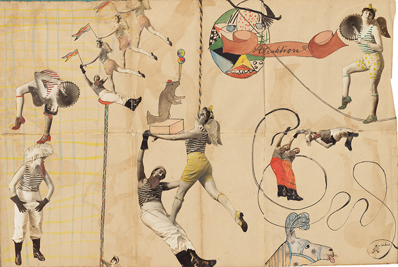 A spectacular foldout photomontage follows illustrating a vibrant circus scene. Here the amateur acrobats perform “attractions” accompanied by a remarkably talented seal and a show horse sticking out its tongue.