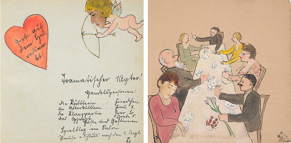 Some of the anecdotes in Die Ringlpitis are light-hearted. Auerbach recounts Stern sleeping in a bed made with wildly patterned sheets, much to her mother’s dismay. Others address the more challenging familial and societal pressures each woman faced. The set of the one-act play Grete on the Marriage Market is a lively dinner party Stern’s mother throws to introduce her daughter to a respectable suitor. Yet Grete is so bored, she falls asleep as the young man—flowers in hand—attempts to talk to her. Stern, like Auerbach, resisted expectations to settle down. The two lived and worked in a shared studio space filled with friends and boyfriends. They embraced openness and play, refuting conventional definitions of gender and sexuality and forging new ways of living and making art. The book is both an intimate object and a humorous declaration of their alternative way of life.