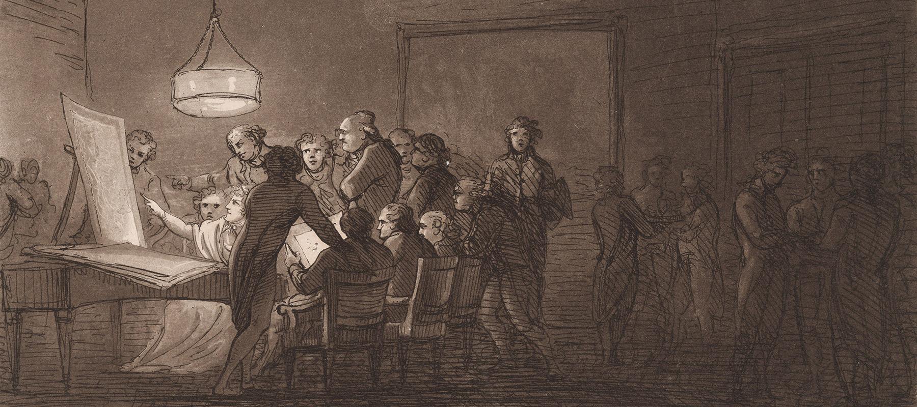 Depicting a woman leading a discussion about art was not the norm. So who is this woman? Fischer provides a clue at the bottom of his print, where he etched the words “d’apres nature par J Fischer 1800.” The French d’après nature means “after nature,” indicating that Fischer witnessed this scene. The woman in white is no imaginary muse, allegory, or symbol. She is a real person whose emphatic gesture underscores her spirited involvement in this discussion. Note, too, how the eyes of the man seated to her right are riveted on her profile. It is tempting to guess further at her identity. Is she an art collector with whom Fischer was attempting to curry favor? Or might she be the artist’s sister, Maria Anna Fischer? She was a talented landscape etcher who occasionally made aquatints, including