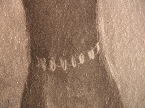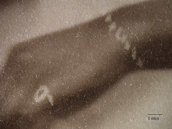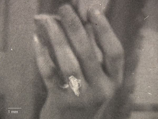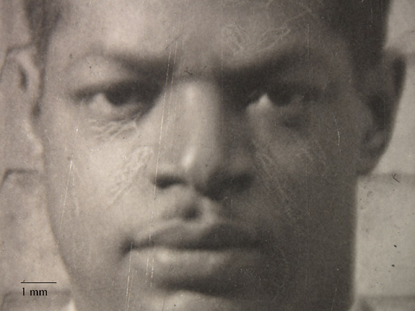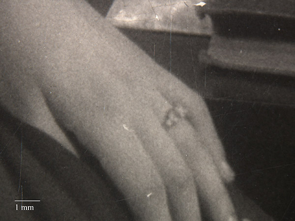 These details from Lady with Wide-Brimmed Straw Hat taken with a microscope at 15x magnification show the bracelet and ring that Van Der Zee drew onto the negative.