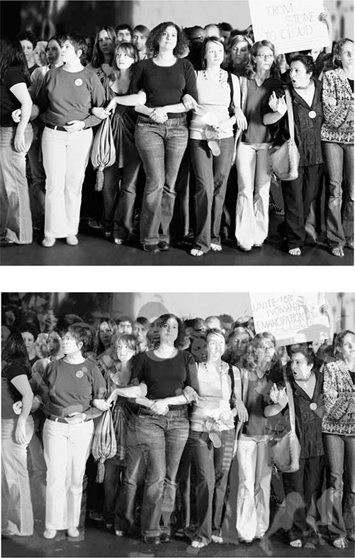 This image slowly dissolves into another one. It is also a photograph, staged to evoke the same march, still in black and white despite having been taken in 2005. But there are subtle differences: the protest sign features a less familiar phrase, “from stone to cloud”—a line from a Sylvia Plath poem.