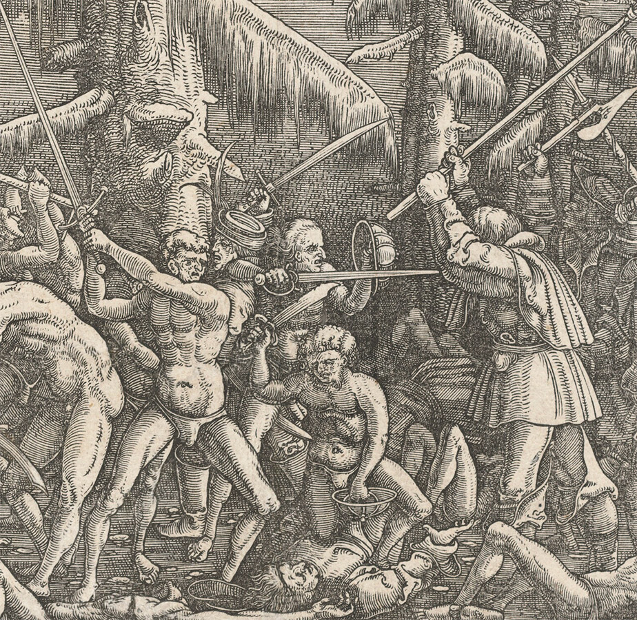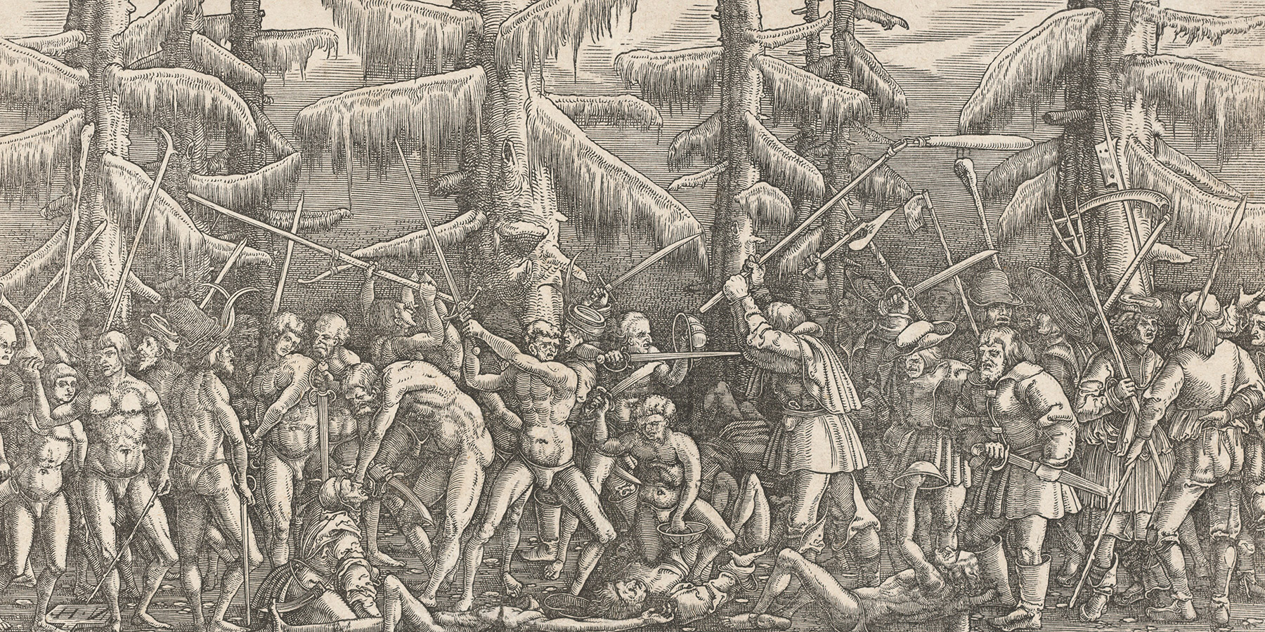 Hans Lützelburger’s Battle of Naked Men and Peasants shows a bizarre stand-off between semi-nude men and German peasants. They strike each other with swords, clubs, and farming tools such as flails and scythes. The men twist in a variety of poses that remind us of carved Roman friezes and earlier Italian engravings. The complex tangle of bodies both recalls and challenges these examples. This battle, however, is set within a northern forest of drooping fir trees and is cut from a humble block of wood. The mysterious subject is not based on any known literary source.