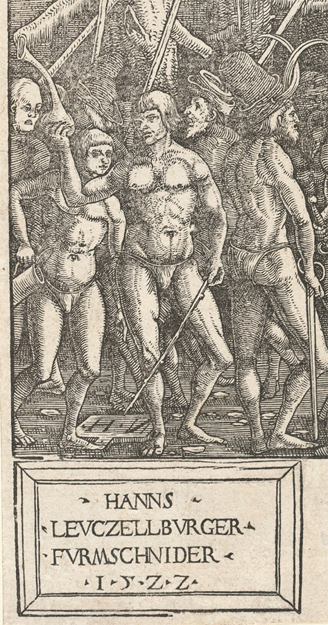 Lützelburger appears to have been the driving force behind this version of Battle of Naked Men and Peasants. We don’t know the name of the artist who designed the print. He is identified only by the initials NH in a corner of the image. Lützelburger, on the other hand, added a woodblock that includes his entire name; confidently proclaims his role as “FVRMSCHNIDER”; and notes the date, 1522.