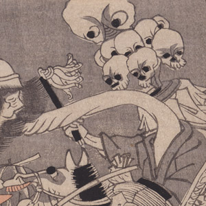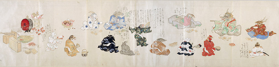 The zodiac animals are often depicted as poets engaged in a contest, with a deer accorded the honor of judging the various poems. A mischievous raccoon dog envies him and asks to be named judge of the next contest, but the zodiac animals laugh at the idea. Undeterred, he gathers an army of friends, including a fox, crow, owl, and weasel, and battles the zodiac animals, but is defeated time after time. Finally seeing the falseness of his ambition, he enters the Buddhist priesthood and seeks enlightenment.