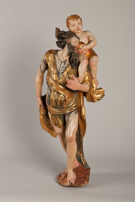 Some of the figures’ garments were carved out of wood, while others were fashioned from additional cloths soaked in glue. The figure of Saint Christopher holds a bit of his clothing in his right hand. This element is composed of real fabric: on the back of the sculpture, the textured fabric is visible, along with some of the extra cloth held back by the hand. This technique was a clever and easy way for Berruguete to form animated passages of drapery.