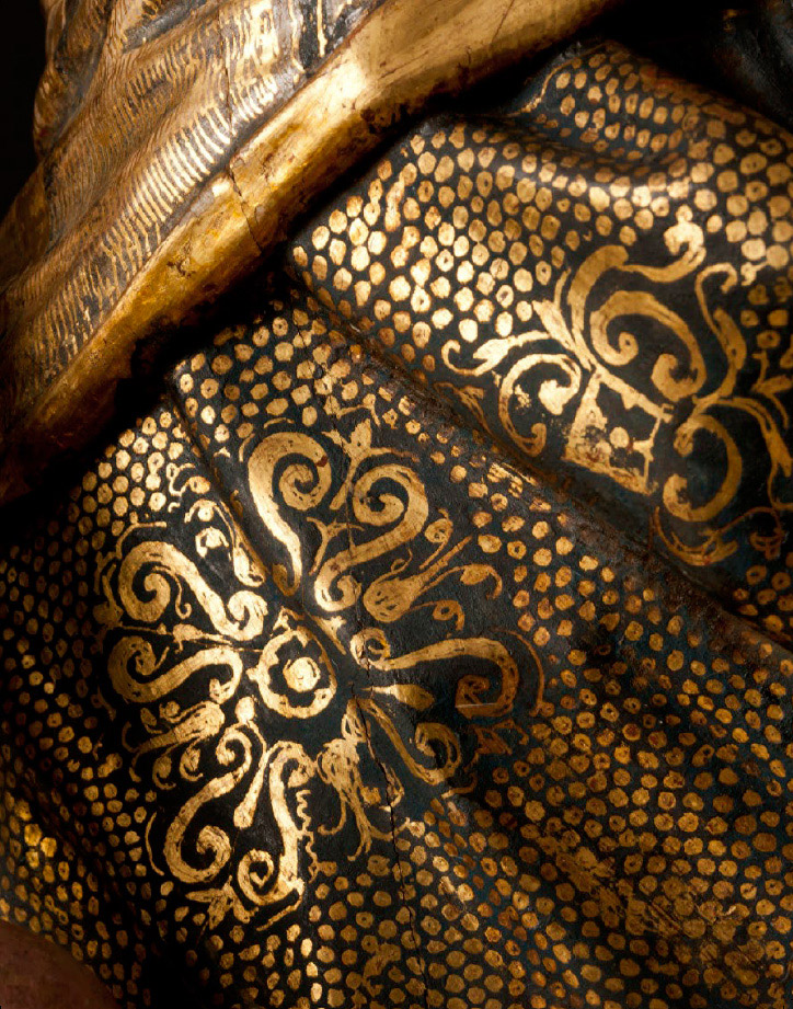 Fig. 16: Alonso Berruguete, The Sacrifice of Isaac (detail of estofado on Abraham’s clothing), 1526/1533, painted wood with gilding, Museo Nacional de Escultura, Valladolid. © Museo Nacional de Escultura, Valladolid (Spain), photo by Javier Muñoz and Paz Pastor