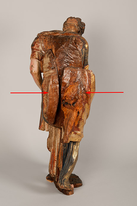 Fig. 4: Alonso Berruguete, Old Testament Prophet (Isaiah?) (from behind, showing addition of two pieces of wood to the figure), 1526/1533, painted wood with gilding, Museo Nacional de Escultura, Valladolid. © Museo Nacional de Escultura, Valladolid (Spain), photo by Javier Muñoz and Paz Pastor