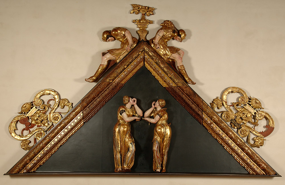 Fig. 12: Alonso Berruguete, Reconstruction of a pediment with soldiers, sibyls, and grotesque decoration, 1526/1533, painted wood with gilding, Museo Nacional de Escultura, Valladolid. © Museo Nacional de Escultura, Valladolid (Spain), photo by Javier Muñoz and Paz Pastor