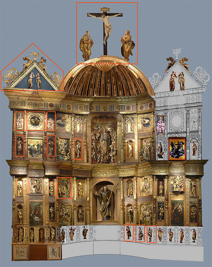 Fig. 1: Reconstruction of the retablo mayor of San Benito el Real, Valladolid. Photo: Museo Nacional de Escultura, Valladolid. The outlined works on this reconstruction of the altarpiece of San Benito are on view in the exhibition Alonso Berruguete: First Sculptor of Renaissance from October 13, 2019 to February 17, 2020. Areas in gray have been lost.