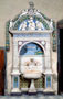 Here Giovanni created a lavabo, or washbasin, whose elaborate design comprises carved marble, painted flat tiles, pilasters decorated with figural sculpture, and an early example of pure landscape imagery in the glazed terracotta lunette. Children standing on the cornice support heavy swags of fruit and leaves on their shoulders. Before this cornucopia of sculptural elements suggesting themes of purification and natural abundance, the priest would wash his hands and cleanse his spirit before moving to the altar.