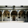 Luca also complemented the architect’s design for the cupola of the portico by covering its inner surface with a coffered pattern of molded tiles. At center appears the Pazzi coat of arms encircled by a fruit and flower garland. Around this, circles of blue and yellow rosettes, ringed with green, leafy wreaths, gradually expand in scale. This brilliantly colorful, reflective, and long-lasting decoration created an effect of opulence contained by rigorous geometry. Both the cupola and its decoration were completed well after Brunelleschi’s death in 1446.