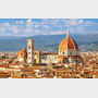 The cathedral of Santa Maria del Fiore is the quintessential monument of Renaissance Florence, its towering masonry dome faced with terracotta tiles rhyming with the warm brick and stone of the city and complementing the green and blue tones of the surrounding hills.