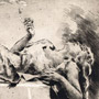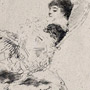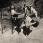 Intoxication exemplifies the embrace of the bohemian life and uninhibited self-expression of the Scapigliatura movement: dragging on a cigarette, a woman reclines provocatively amid empty wine glasses on a bunched-up tablecloth. The print is a fine example of how Conconi would establish a composition with a mere framework of etched lines on the plate and then develop the appearance and expressive character of each impression through inking alone. This “monotype inking” was characteristic of printmaking in Milan in the late nineteenth century.