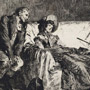 The revival of pure, artistic etching was not limited to the original works of painters like Fontanesi, Fortuny, and Bianchi. From the same time, starting in the 1860s, reproductive printmakers turned to the technique, with its potential for more convincing naturalism and vigorous personal expression, for their interpretations of new kinds of painting that ranged from scenes of recent history to subjects from literature and daily life (such as the contemporary painter Sala’s popular depictions of animals). Colombi Borde, along with Turletti and Pagliano, were masters of this of type of print.