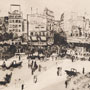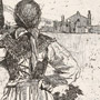 This print is the most unconventional and celebrated of Signorini’s eleven views of the area of Florence’s old market, which had just been demolished to make way for the construction of the Piazza della Repubblica. A much-venerated fourteenth-century tabernacle (street shrine) is located on the corner at the left of the composition, just behind the woman hauling a basket on her head. While the stacked and bulging middle ground conveys the previously teeming life of the area, the abstract shapes formed by the uninterrupted edges and patches of sky anticipate modernist city views of a half-century later, by artists like Charles Sheeler.