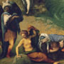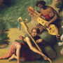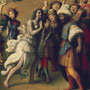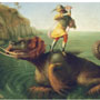 Ovid’s Metamorphoses tells the legend of the princess Andromeda, who was abandoned as a sacrifice to a sea monster. The warrior Perseus, flying on winged sandals, saw Andromeda from above and fell in love with her. After slaying the fearsome beast, he rescued the beautiful maiden and won her hand. Piero painted this version of the tale for the Strozzi family of Florence. The oblong narrative composition may originally have been a spalliera painting: a fanciful mythology set within paneled walls in a domestic setting at shoulder (spalla) height. Liberation of Andromeda adorned the marital chamber of Filippo Strozzi the Younger and Clarice de’ Medici. According to his biographer, Giorgio Vasari, “Piero never made a more lovely or more highly finished picture than this one.”