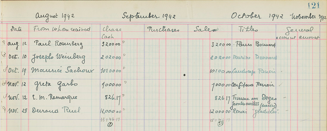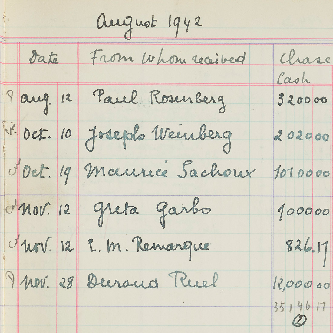 Greta Garbo (1905–1990) was one of many illustrious clients who purchased art from Sam Salz. Garbo’s full name is notated in this inventory book on November 12, 1942, having purchased Pierre-Auguste Renoir’s Confidence for $7,000. Salz’s close friend, author Erich Maria Remarque, is listed on the line below Garbo as purchasing an Edgar Degas drawing, Femme aux Jambes Croisées, for $826.17 the same day.