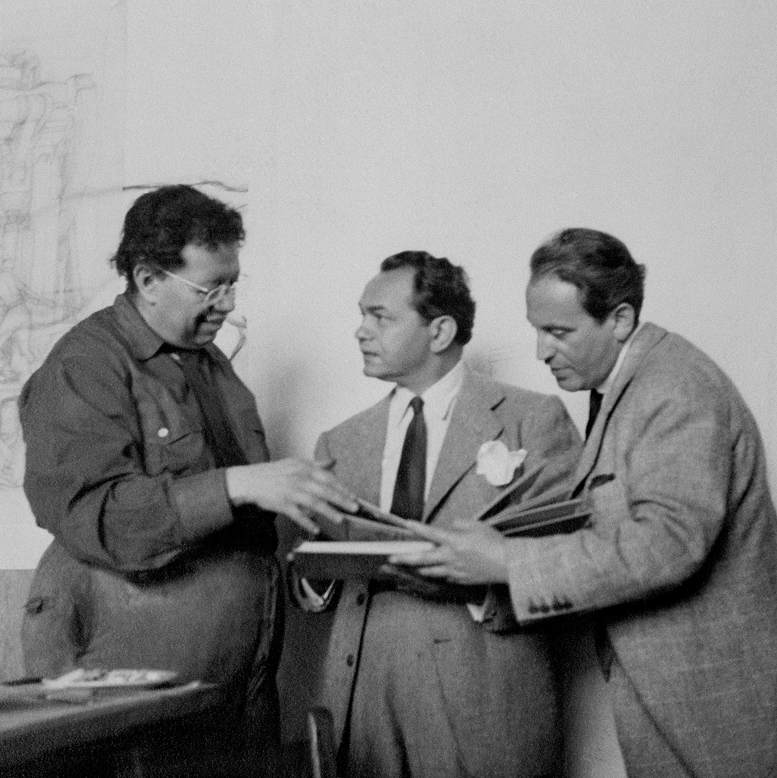 Unknown photographer, Diego Rivera, Edward G. Robinson, and Sam Salz in Rivera’s San Francisco Studio, 1940, digital print from negative, printed 2022, Gift of Marc Salz in memory of his father, Sam Salz, Sam Salz Archive, Department of Image Collections