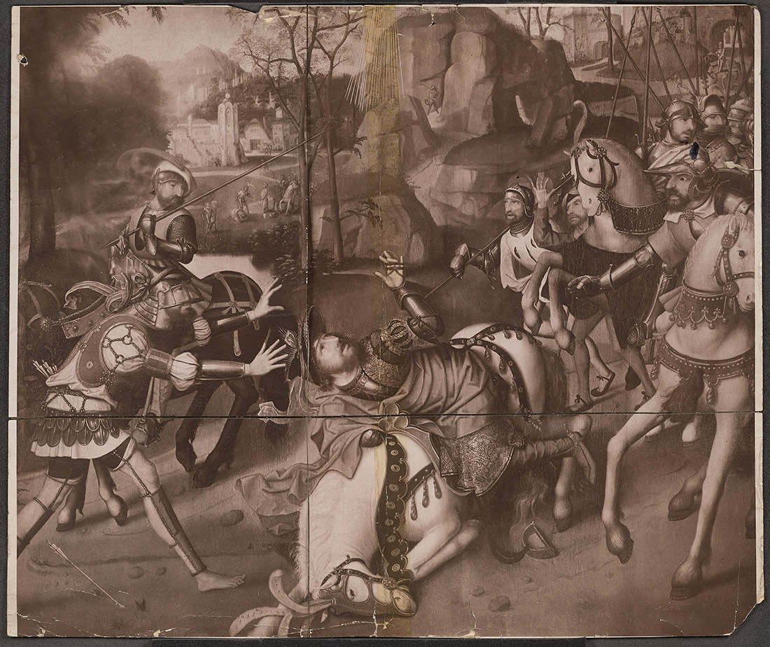 German scholar and curator Dr. Max J. Friedländer took this photograph of Jean Bellegambe’s sizeable panel painting, The Conversion of St. Paul (1520s), probably during one of his European travels studying paintings in private collections. Friedländer crafted this oversize image by stitching together four separate photos from four quadrants of the composition, unifying them with cellulose tape, the only technology he may have had available. It was a creative solution that allowed him a greater overview of the painting. Once the photo was folded up, it became portable and fileable. Some of Friedländer’s photos went to dealers or other scholars, offering his views on attribution, condition, and ownership, but most were ultimately the foundation for his personal photographic archive.