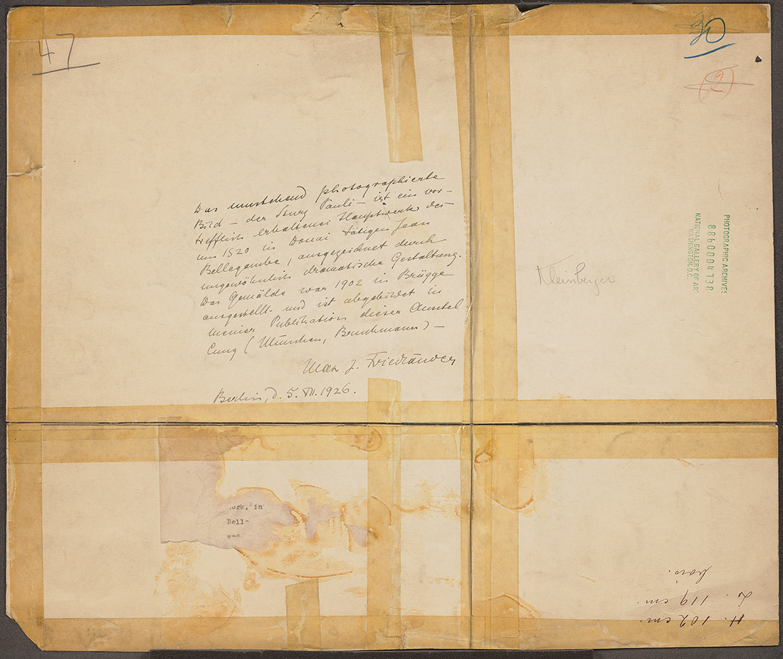On December 5, 1926, while in Berlin, Friedländer made significant notations on the back of this photo. By this time, he was director of the Kaiser Friedrich Museum and was a highly respected scholar of Northern Renaissance painting. Dealers, collectors, and scholars alike would have been interested in his professional opinion. His notations, in German, identify the artist, subject, and date of the painting, mention that it was exhibited in Bruges in 1902, and included in his exhibition publication in 1903. The Bellegambe painting went on the market in 1927. Friedländer’s notations confirming its attribution may have served as authentication before it was offered for sale.