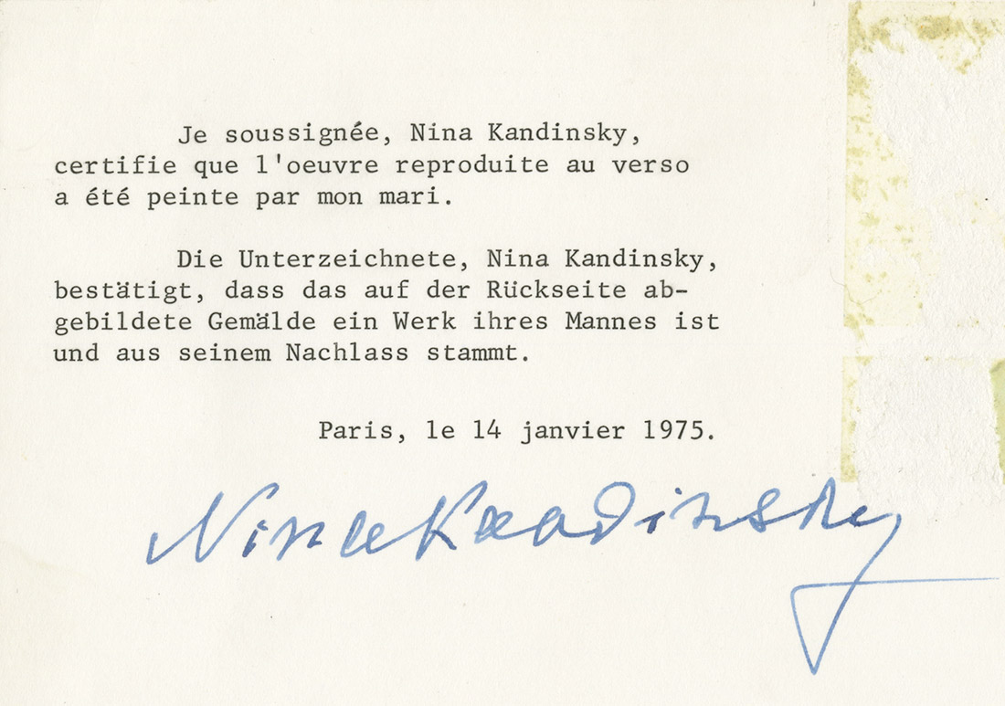 The painting was uncovered after Kandinsky’s death when his widow, Nina, found it wrapped in a Munich newspaper dated 1908, further solidifying the painting’s execution date. Interestingly, this work was not included in the inventories the artist made of his paintings. In charge of his estate, Nina may have been asked to substantiate the attribution and date of the painting by providing signed certification that it was part of her late husband’s oeuvre. With her statement, written in French and German, and signature on the back, Nina attests that the work of art depicted in the photograph was painted by her late husband. The painting is now in the Carmen Thyssen-Bornemisza Collection in Madrid. The 1977 inventory number indicates that it entered the collection two years after Nina’s certification. The photograph likely served to authenticate the painting prior to its sale.