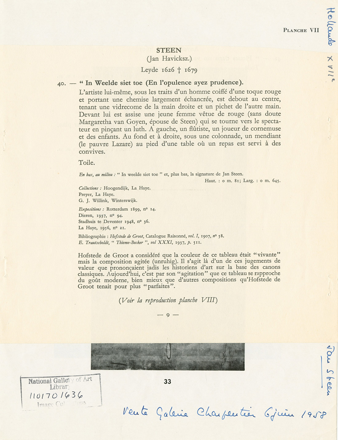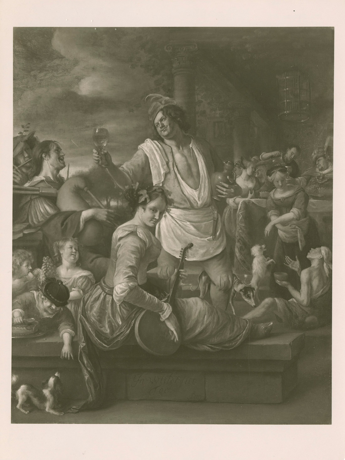 With its rich and complex history of ownership, Rich Man and Lazarus or In Luxury Beware, by the Dutch artist Jan Steen (1626–1679), demonstrates how a variety of sources can confirm origin. The composition prominently depicts a reveler in the foreground and the parable of Lazarus and the rich man (Luke 16:19–31) in the background. After leaving Jan Steen’s possession, the painting is next recorded in Amsterdam by 1899 and then with the preeminent Dutch dealer and collector Jacques Goudstikker by 1920. It moves among various Dutch private collectors, and by 1937 it goes from the Dutch dealership D. Katz to the Schaeffer Galleries in New York, and back to D. Katz.