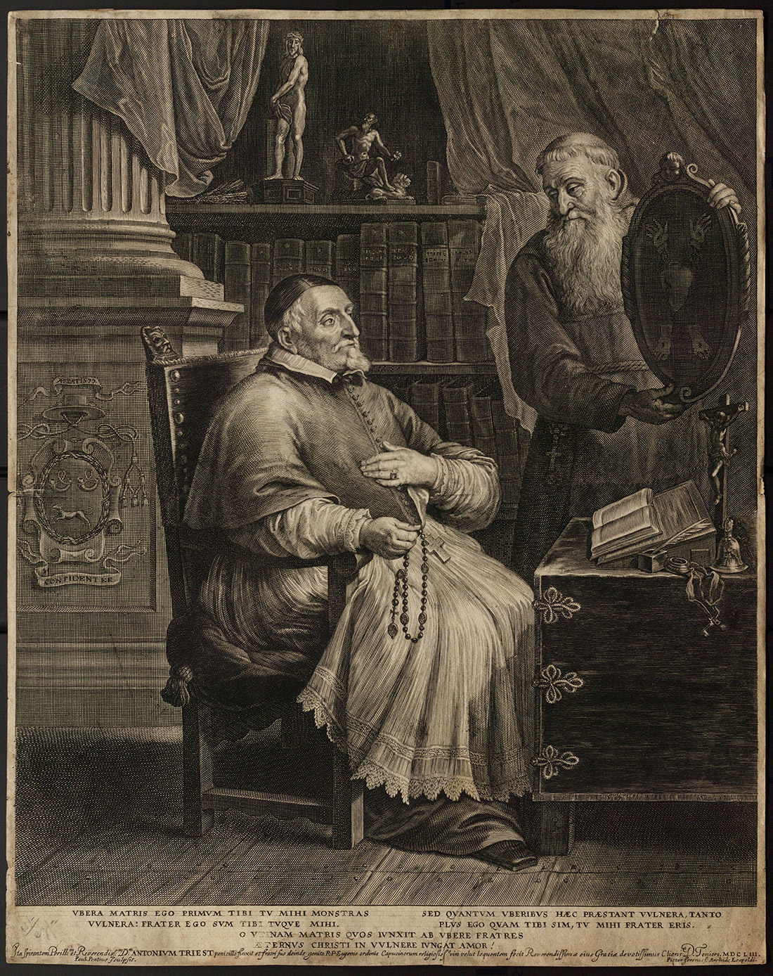 Triest commissioned Teniers to paint his portrait in 1652. A year later Paulus Pontius reproduced it as an engraving, making famous Teniers’s original painting of the bishop. Two prominently displayed sculptures, one of Christ Bound and the other of a Penitent Jerome, sit atop the bookcase behind Triest.