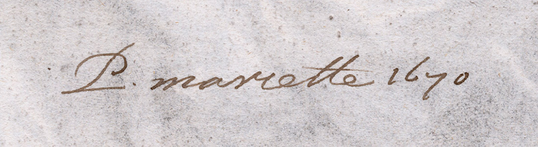 However, if you turn the print over, significant marks on the back provide a compelling piece of the print’s history. A clearly executed signature and date in brown ink in the lower quadrant of the sheet read “P. Mariette 1670,” announcing the owner, Pierre Mariette II. It was common practice for Mariette, collector, engraver, and considered the greatest publisher of the century, to add his monogram.