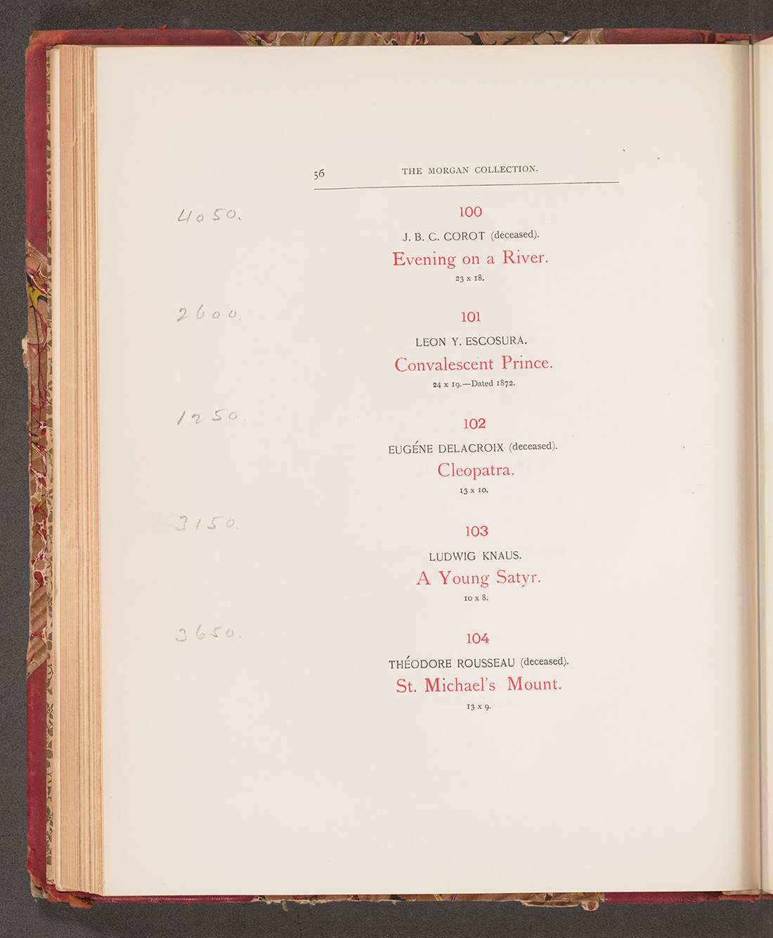 This finely crafted, leather-bound publication is an auction catalog documenting the 1886 sale of Mary’s collection, illustrated with miniature portraits of the artists, photographs, and etchings reproducing works in her collection by Jean-Baptiste-Camille Corot, Théodore Rousseau, Jean-François Millet, and Thomas Moran, among others. The American Art Association, a newly formed but prominent New York auction house, the first in the United States, organized the 13-day sale that took place at Chickering Hall on March 3–15, 1886, with 2,628 lots available for purchase. Next to each lot listed are hand annotations of the hammer price, providing a valuable record of the sales price.