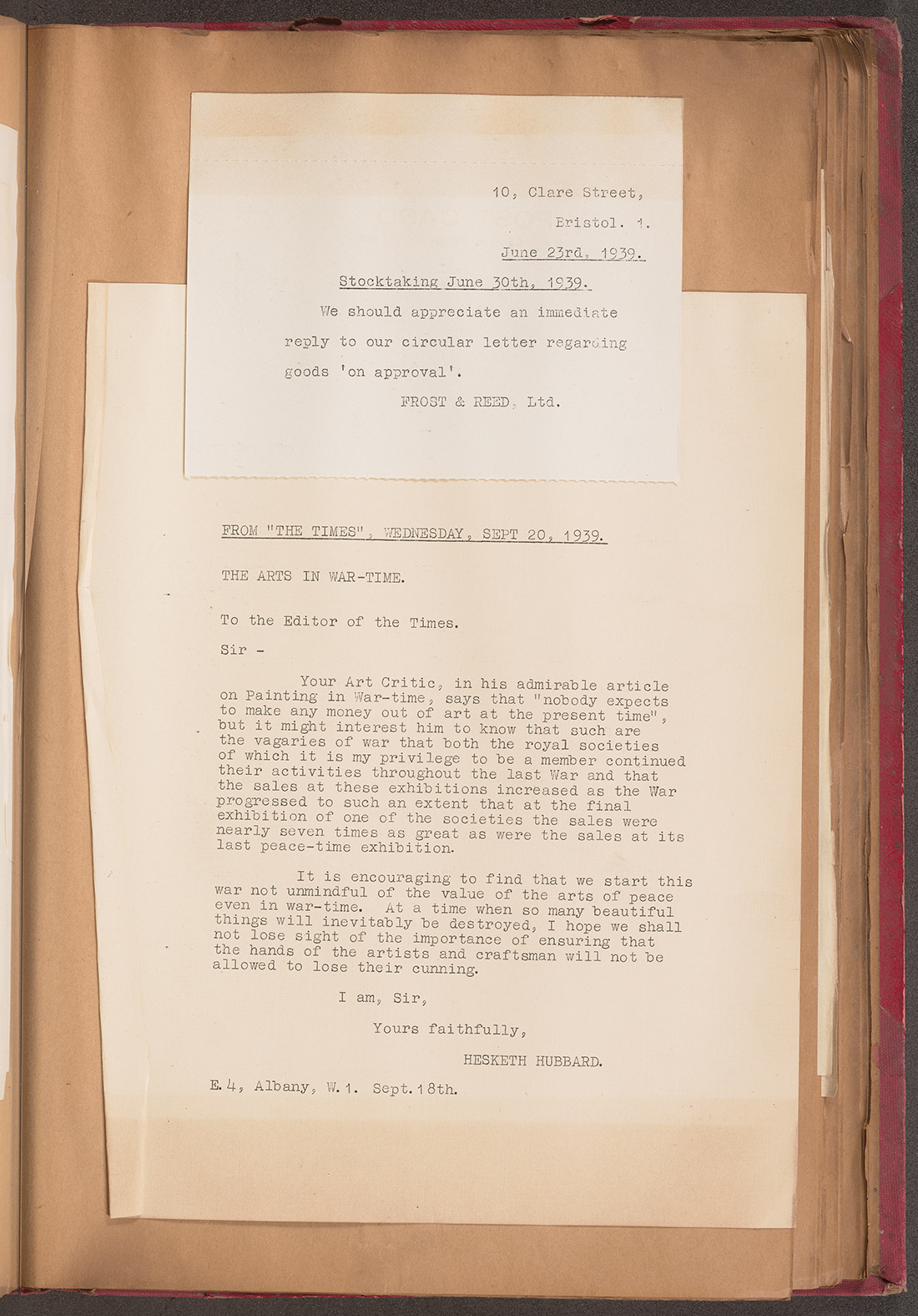 Some of the most interesting company documents from 1936 to 1944 relate to the fate of the art market at the beginning of World War II. A transcription from a letter to the editor of the London Times, dated September 20, 1939, laments that artworks will “inevitably be destroyed” in the war that had just been declared days earlier on September 1.