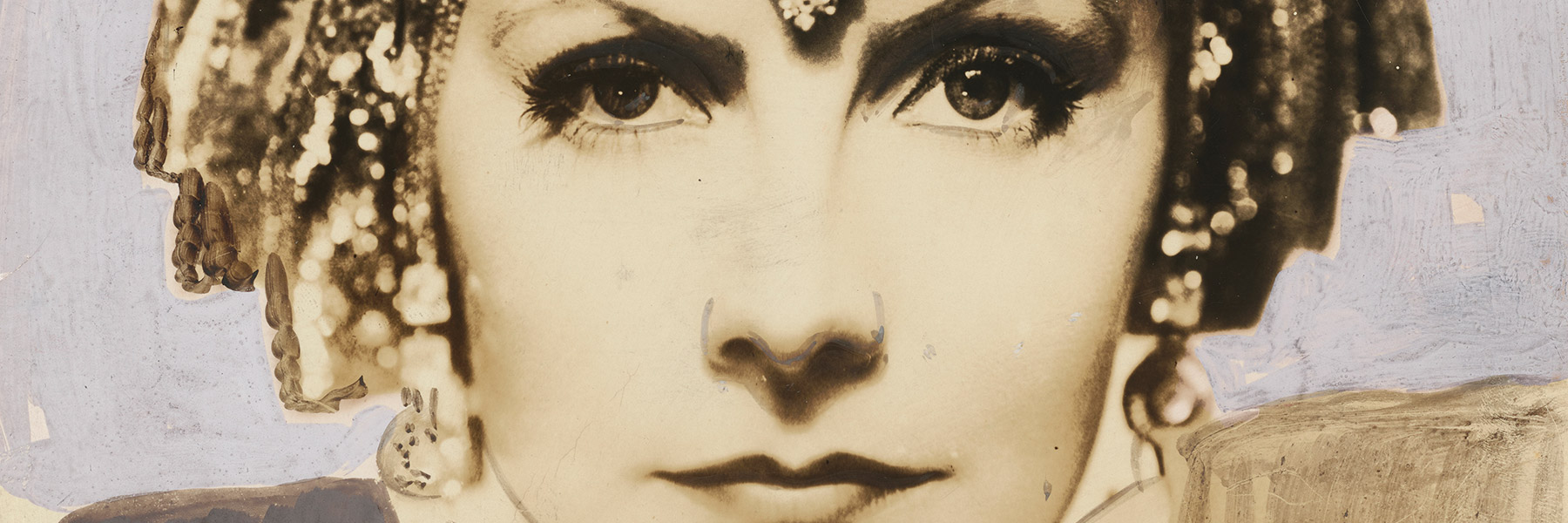 This photograph is part of a major gift of 700 distinguished photographs from Mary and Dan Solomon to the National Gallery of Art. Of those, 400 are press photographs, including this headshot of Greta Garbo in a golden headdress, a publicity shot for her starring role in the 1931 hit film Mata Hari. This image demonstrates how press photographs could be manipulated—in this case with the application of gray and black ink, blocking out Garbo’s shoulders and chest and making her face and hands more prominent, particularly emphasizing her piercing gaze.