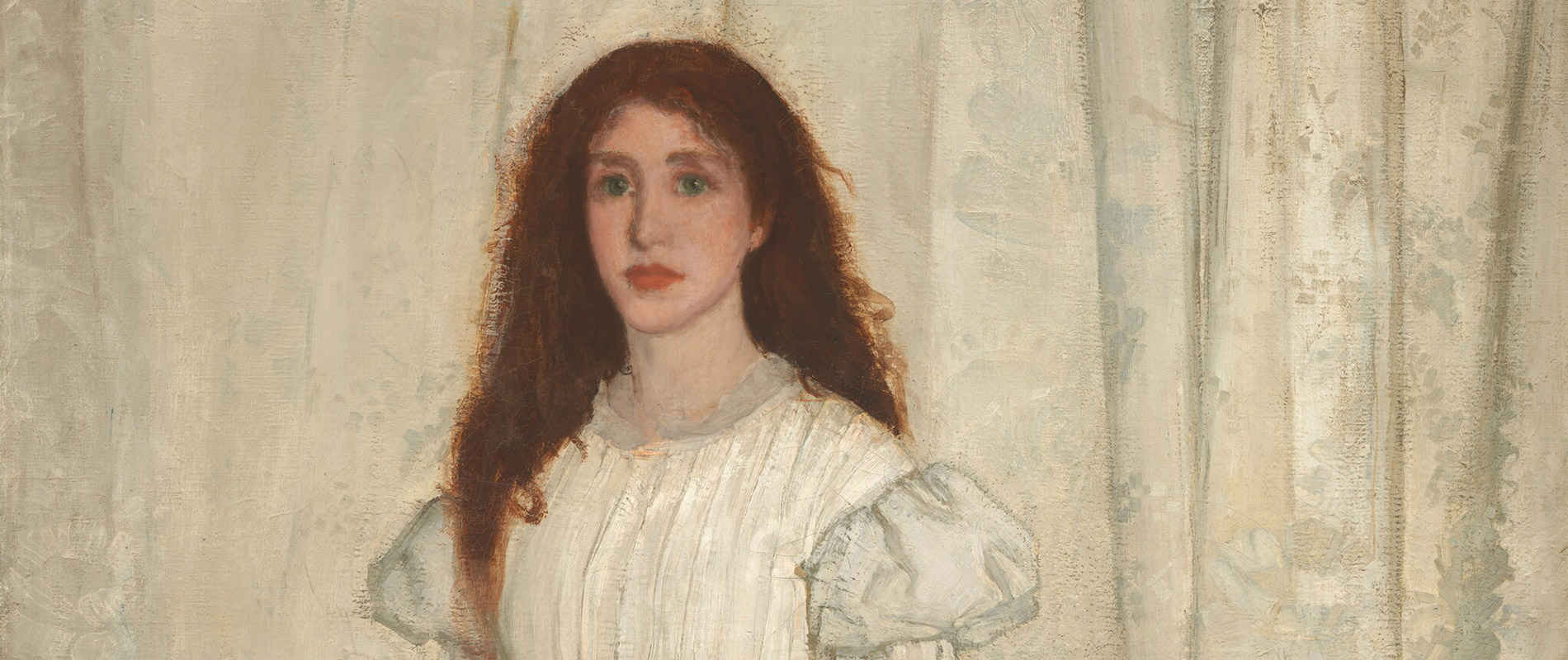 The most iconic, full-length portrait of Hiffernan (originally titled The White Girl) was advertised at a commercial gallery as “The Woman in White,” a reference to the acclaimed mystery novel by Wilkie Collins (1859). Whistler refuted the association, claiming, “My painting simply represents a girl dressed in white standing in front of a white curtain.” A few years later, Whistler took a different stance, asserting that the painting was an aesthetic experience analogous to music, a “symphony in white.”