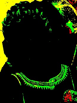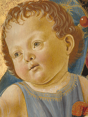 Ghirlandaio’s Madonna and Child, detail of the head of the Christ child with gold-colored collar