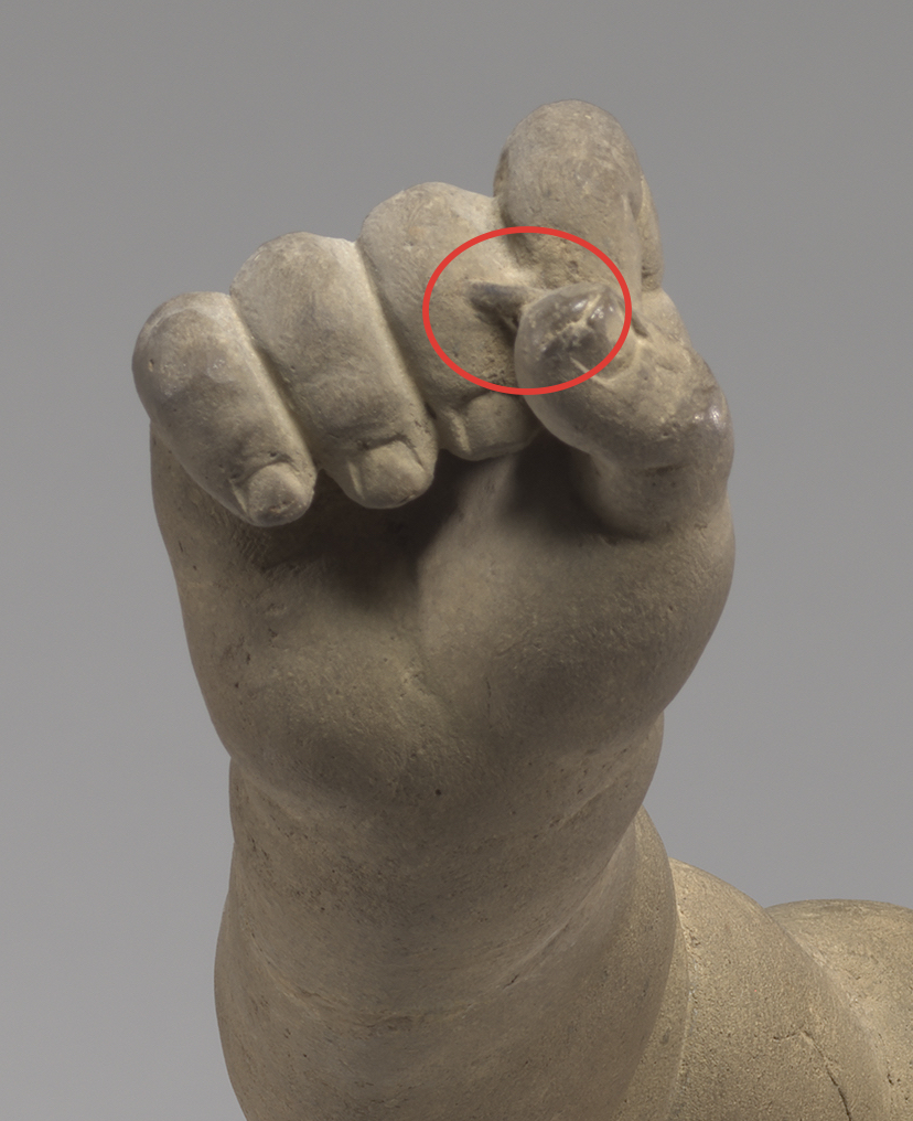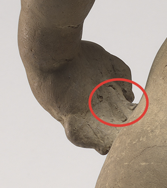 A small piece of armature wire is visible between the thumb and middle finger of the extended right hand. Beneath the clay in the palm of the left hand, you may also see the shape of a nail, which secures it to the putto’s hip.