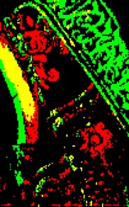 In addition to the background, other areas of Ghirlandaio’s painting appear to be gold, such as the collar of Christ’s robe, parts of his halo, and the border and lining of Mary’s cloak. But is all that glitters actually made of gold? To answer that question, scientists used x-ray fluorescence imaging to identify the different elements, such as gold, tin, or lead, that could be found in the materials used by the artist. In the images produced by this analysis, gold shows up as yellow, tin-based pigments as red, and pigments made of lead mixed with tin as green.