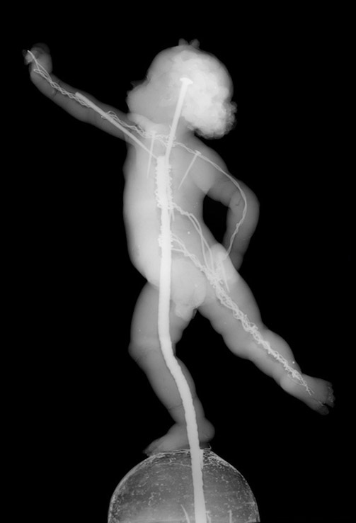 The putto stands on a rounded wooden base that at some point was repainted and given a decorative molding, leading scholars to ask whether the entire base is a later addition to the sculpture. X-rays have provided the answer. They show that the central armature extends through the base and is nailed to its bottom. This proves that the base is original to Verrocchio, who used it as a stand while he made the sculpture.