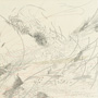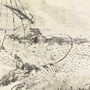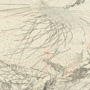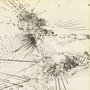 Less than three weeks after Hurricane Katrina made landfall in Louisiana, Mehretu began work at Crown Point Press. Rather than addressing the hurricane specifically, she took on the dynamic patterns of storms in general. Fluid brushstrokes dominate the working proof for Circulation — they suggest cloudbursts, zigzag lightning, blasting precipitation — and create a tempestuous scene that evokes mythological storms or the biblical Deluge (see banner, above). In contrast, the crisper lines and radiating red parabolas added to the final print call to mind contemporary meteorological imagery: weather maps, Doppler radar, storm fronts, wind speeds, vectors, and so forth. Having pushed Circulation in one direction, Mehretu changed course, transforming a freely drawn, turbulent scene into a more precise, scientific, and modern view.