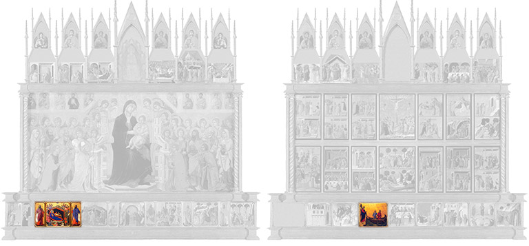 The altarpiece remained at the cathedral for the next 450 years. It was practically an element of Gothic architecture itself, elaborately topped with pinnacles and gables resembling the cathedral’s façade, the whole outlined with gilded framing, supported by buttresses (for it was freestanding), and likely situated on the high altar beneath a four-posted baldachin, or ceremonial canopy. The focal point of this towering shrine was a luminous, gilded expanse of painting depicting the Virgin and child enthroned. It is this scene that gives the altarpiece its name, the Maestà, meaning Virgin in majesty. The Nativity with the Prophets Isaiah and Ezekiel occupied a place on the left side of the predella, or horizontal series of paintings forming the base of the altarpiece. The reverse of the altarpiece comprised a complex array of 40 detailed vignettes from the life of Christ and his Passion.