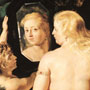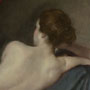 Two cupids attend Venus. One holds the mirror as the other reaches to crown her with a garland. She adheres closely to the canon of female beauty extolled by Renaissance poets: blond hair, fair skin flushed with pink, red lips and arched brows. For Venus’ pose, Titian ingeniously transformed a well-known ancient statue in the Medici collection, yet this Venus has no trace of marble’s coolness. It vividly conveys the warmth and glow of yielding flesh, the richness of velvet, and the glint of gold embroidery. We sense as much as see the softness of the fur-lined robe as it brushes against her skin and the smooth perfection of her rose-tinted cheek. A cupid’s wing shimmers with iridescence.